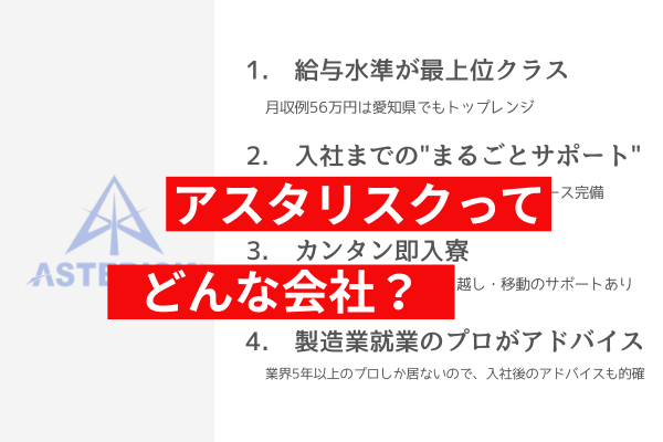 アスタリスクは、愛知県(豊橋、豊田、安城)を拠点に、自動車・部品・食品・物流など、地域産業を支える派遣会社です。