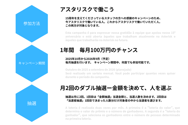 今、アスタリスクで働いている方も、これから働く新しい職場を探している方も。「せっかく働くなら、少しでも自分にプラスになる会社がいい」ーそんなあなたに知って欲しい、アスタリスクの”ありがとう”の形があります。それが、15周年記念・100万円毎月誰かに当たるキャンペーンです。