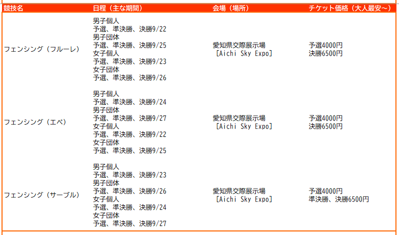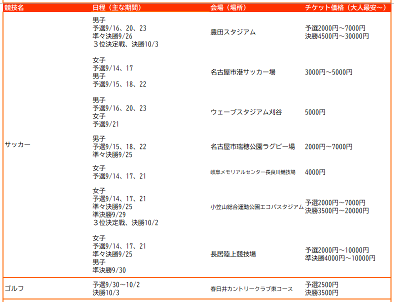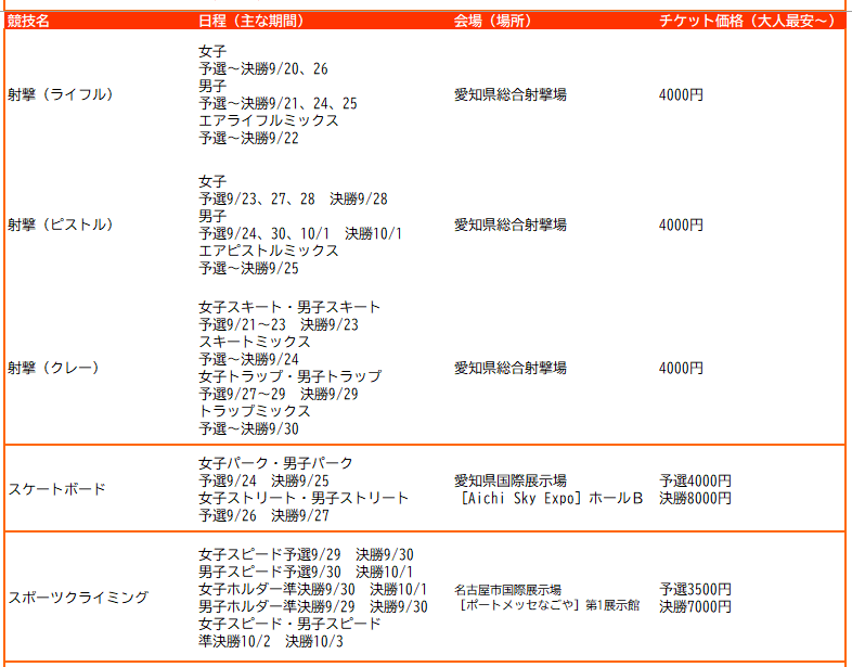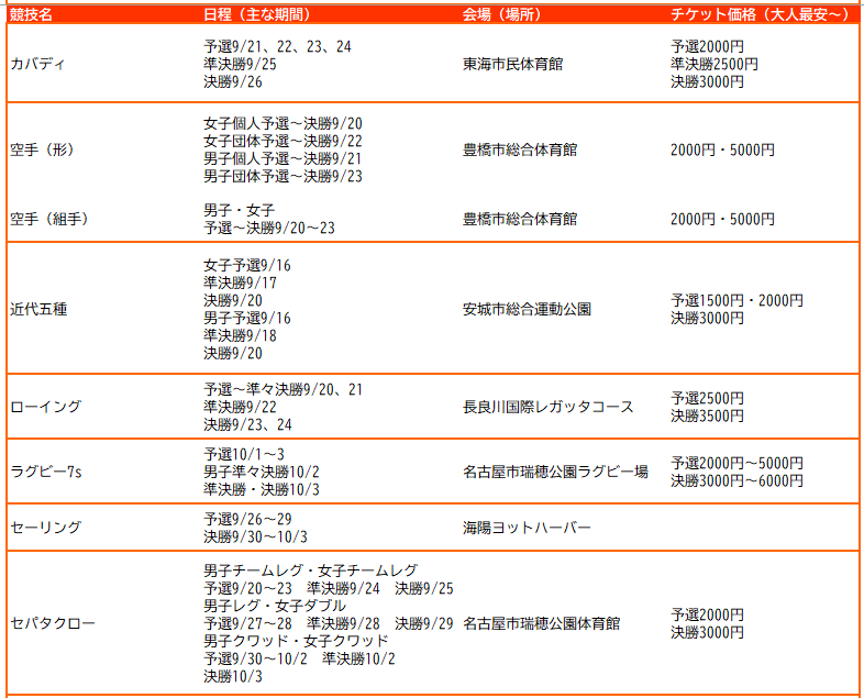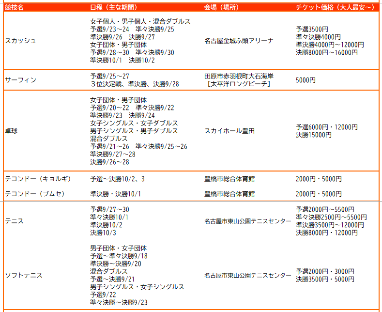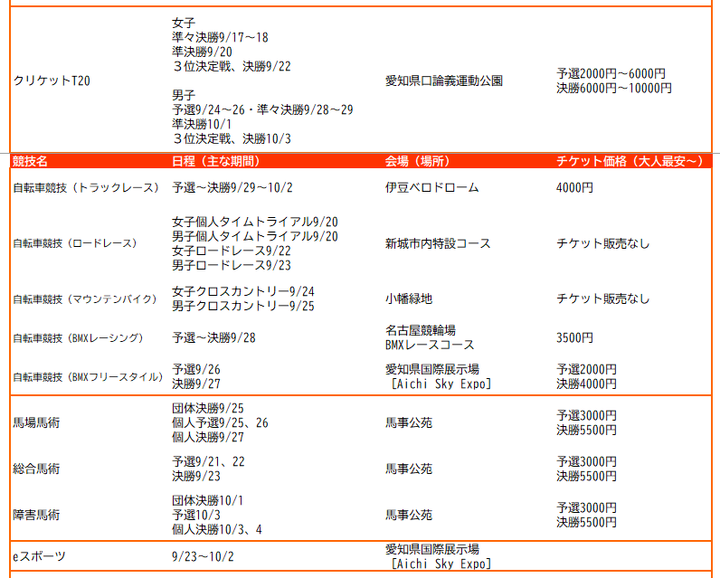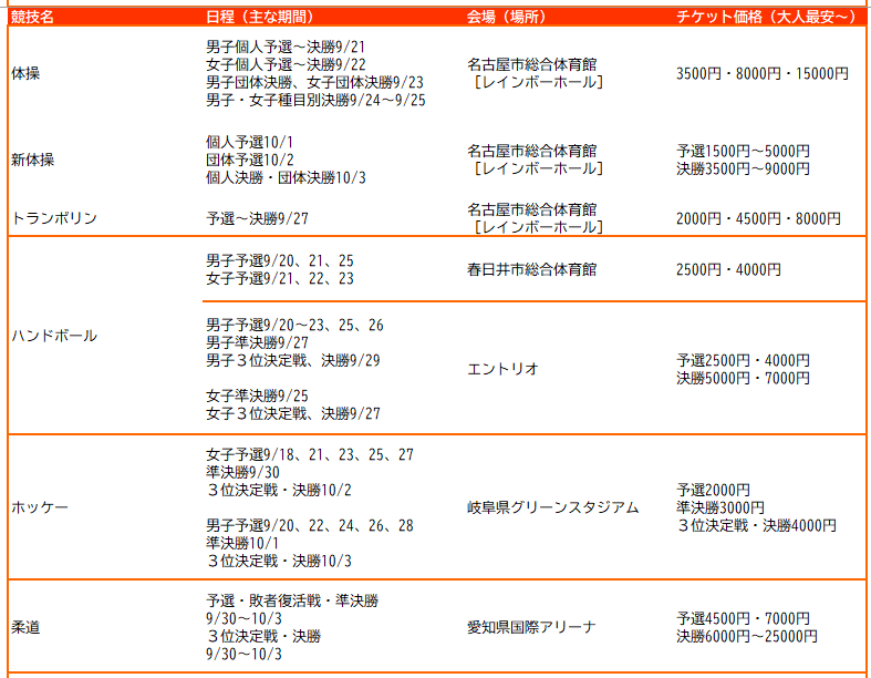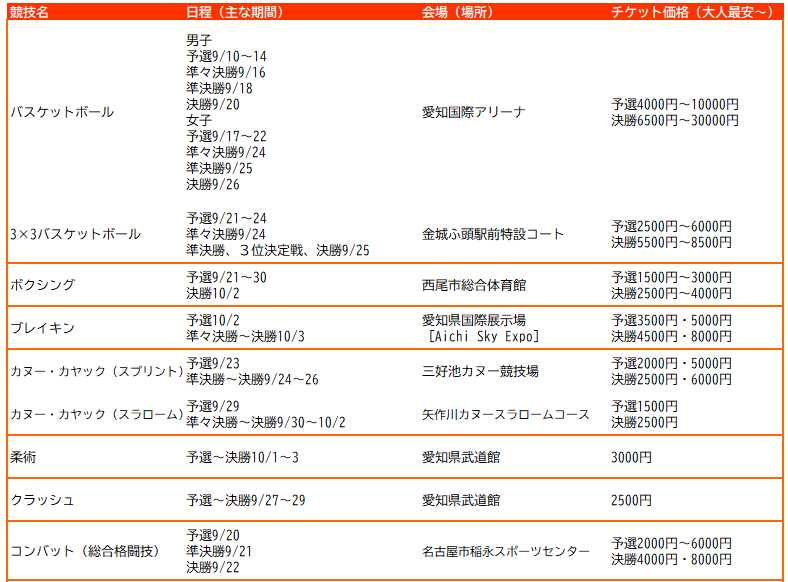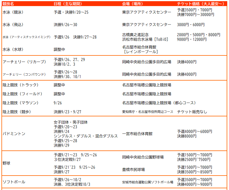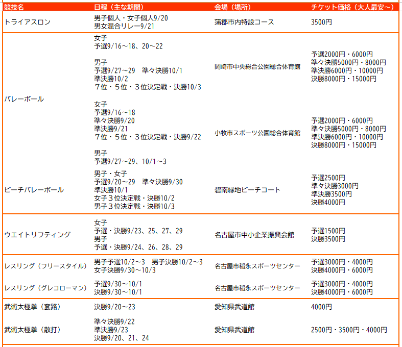 名古屋市内だけでなく、豊田市や常滑市(空港近く)、さらには静岡県(自転車・水泳の一部)や東京都(水泳)での開催もあります。宿泊地からの移動時間を要確認です。